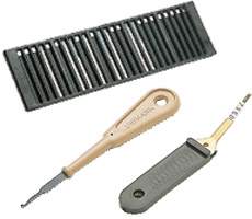» Bandeja/lengüeta de metal/gancho de metal Bandeja para 25 tiras de identificadores BK. En la bandeja se pueden clasificar de forma clara los identificadores que se necesiten y se pueden extraer de ella fácilmente con la lengüeta de metal. La lengua de metal es utilizada para extraer los identificadores e introducirlos en las fundas portaidentificadoras u otros soportes de identificación utilizados. El gancho de metal es necesario para extraer los identificadores de las fundas de identificación.